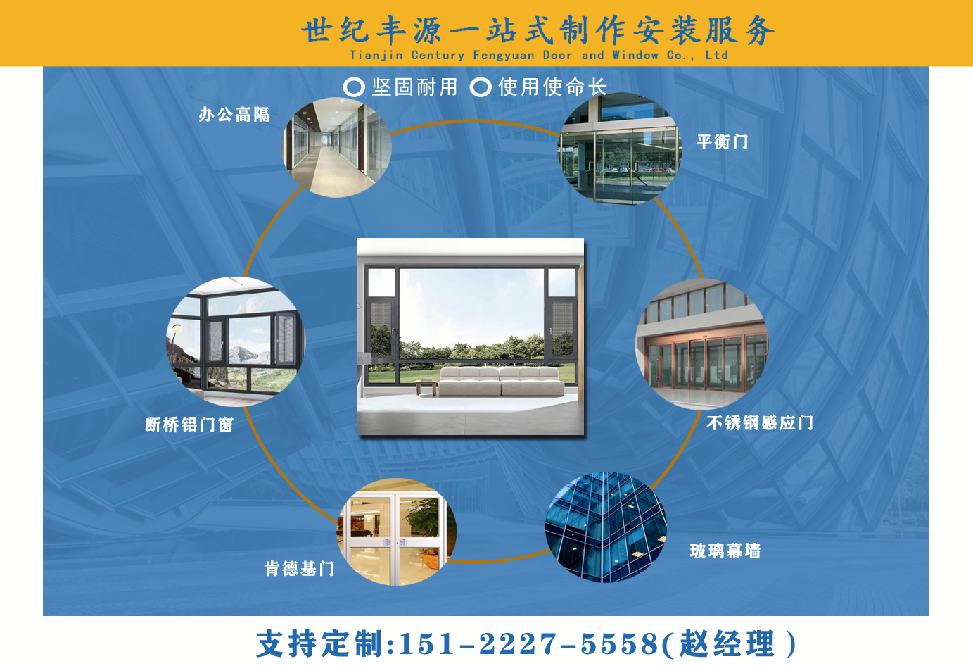 天津世紀(jì)豐源門窗有限公司從事斷橋鋁門窗,玻璃幕墻,平衡門,肯德基門,不銹鋼感應(yīng)門,百葉窗,辦公高隔,制作安裝一站式訂制生產(chǎn)及配套服務(wù)等?! 」咀猿闪⒁詠恚冀K堅持以人才為本、誠信立業(yè)的經(jīng)營原則,薈萃業(yè)界精英,成熟的技術(shù)、管理方法及企業(yè)經(jīng)驗(yàn)與國內(nèi)企業(yè)的具體實(shí)際相結(jié)合,為企業(yè)供給各個方面的解決方案,使企業(yè)在激烈的市場競爭中始終堅持競爭力,實(shí)現(xiàn)企業(yè)快速、穩(wěn)定地發(fā)展?! ≠|(zhì)量好、服務(wù)好、才能信譽(yù)好,公司已在諸多領(lǐng)域取得輝煌成績,愿意成為您可信賴的長期合作伙伴。 讓我們攜手同行,共同實(shí)現(xiàn)“讓普通老百姓都用得上高端門窗”...
